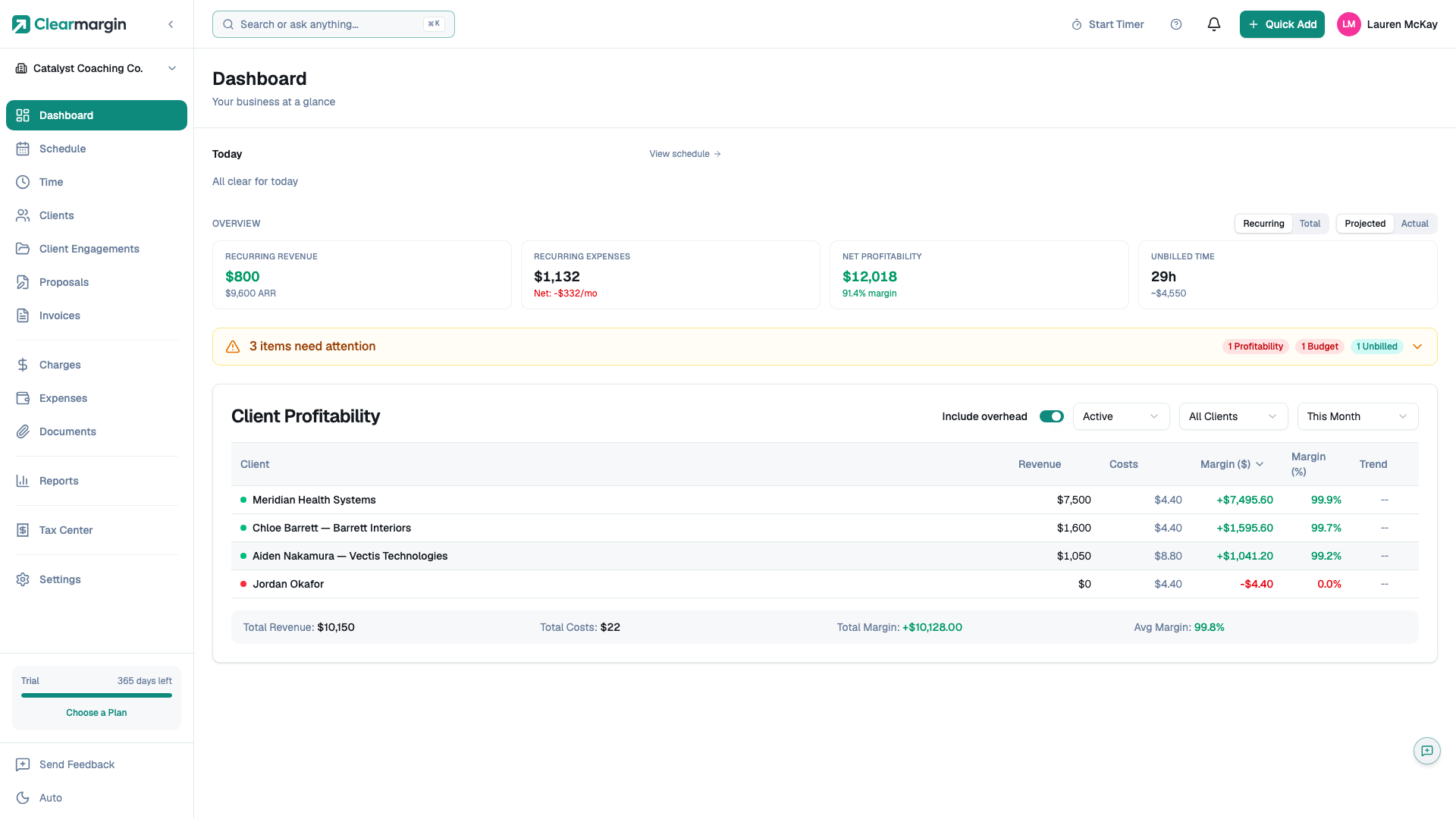 See revenue, time invested, and true margin per client. Know which coaching packages actually make you money.