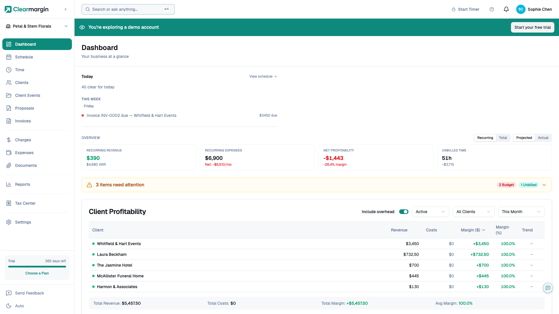Explore a demo account pre-loaded with realistic florists data — proposals, invoices, expenses, and profitability reports.