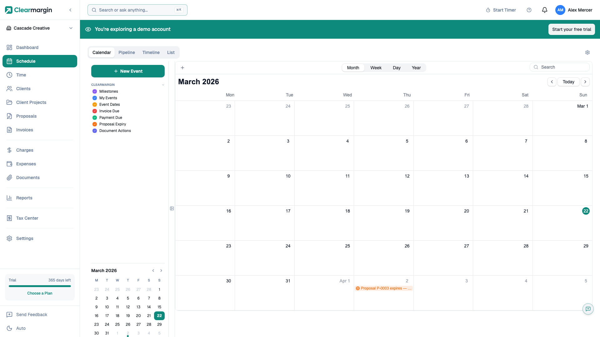 Stop juggling a calendar app, a project tracker, and a spreadsheet. Clearmargin combines your schedule, client pipeline, and project milestones into a single unified workspace.